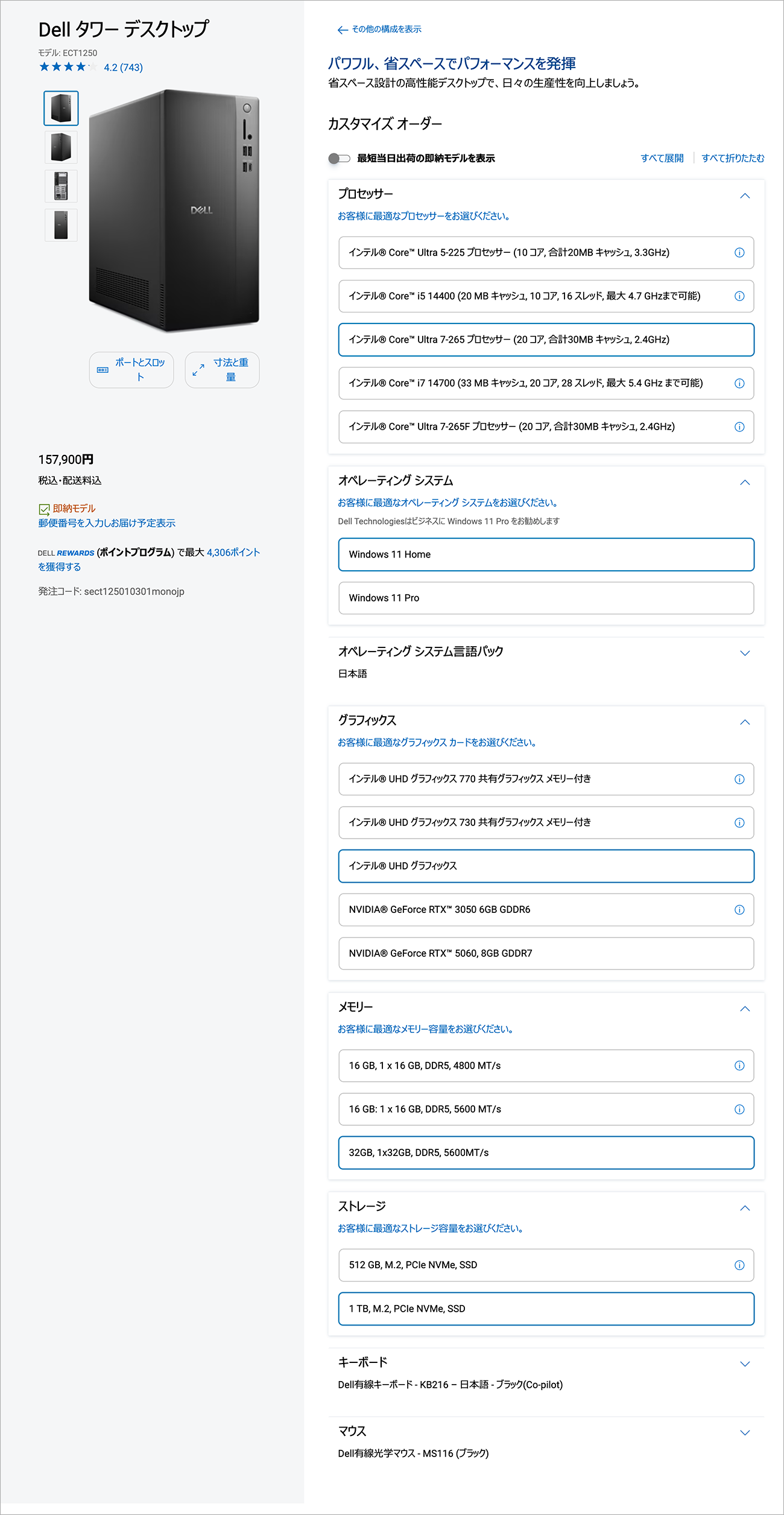 Dellの商品ページでは、以下のよう希望の構成を細かく決めたうえで商品を購入することができます。