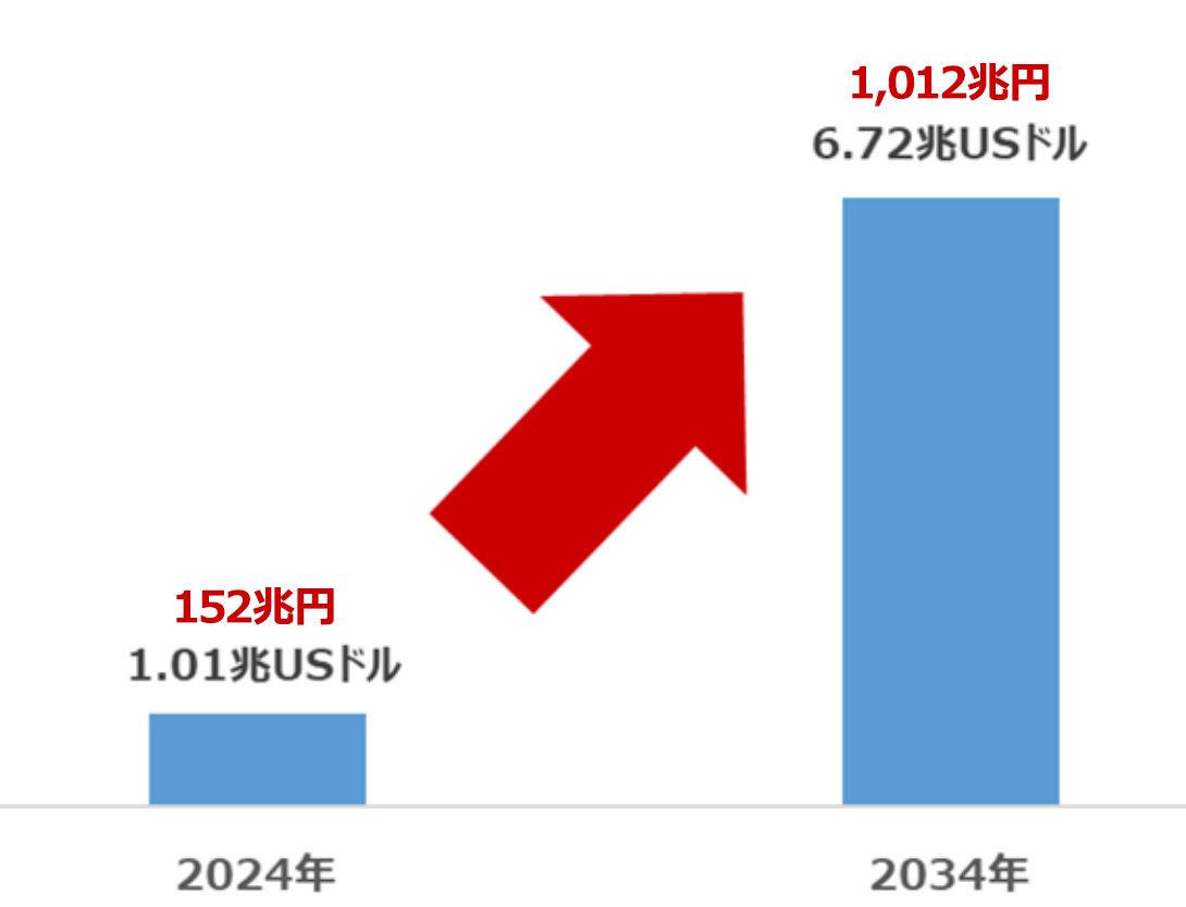 世界中で自国にはない品質の良い商品をECサイトで安く購入する動きが活発となり、越境ECの市場規模は2024年は約152兆円(2024年の年間平均レート:1ドル150.6円換算)と推計され、さらに2034年予想ではおよそ1,012兆円(同レート換算)の市場になると経済産業省の下記レポートに報告されています。