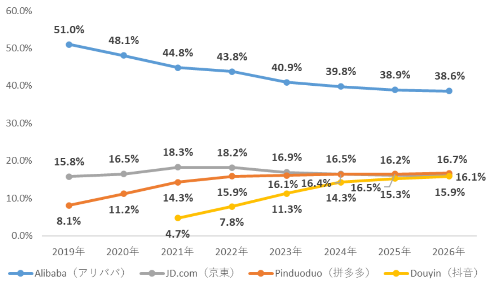 ◆中国における3大EC事業者のシェアの推移(2019年〜2024年)
