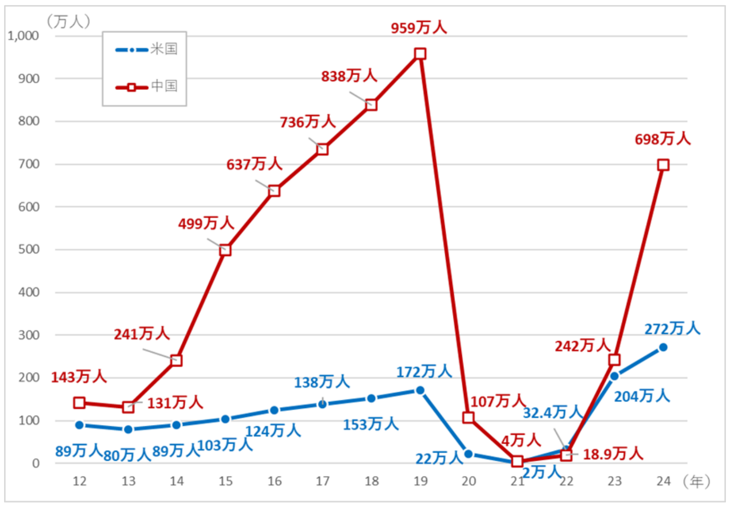 しかし、2024年においては698万人と見事なV字回復を果たし、インバウンドがコロナ前の水準に戻ってきました。