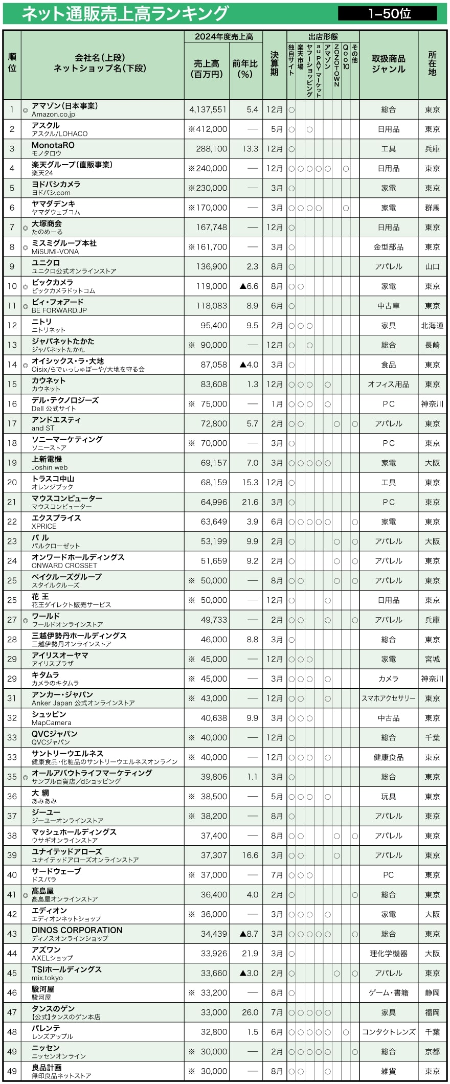 ランキングの引用元はこちらです。無料会員登録することでランキングTOP100までご覧いただけますので、ぜひ登録されることをお勧めします:【2025年版】「ネット通販売上高ランキングTOP545」発表!<会員限定でTOP100を公開>
