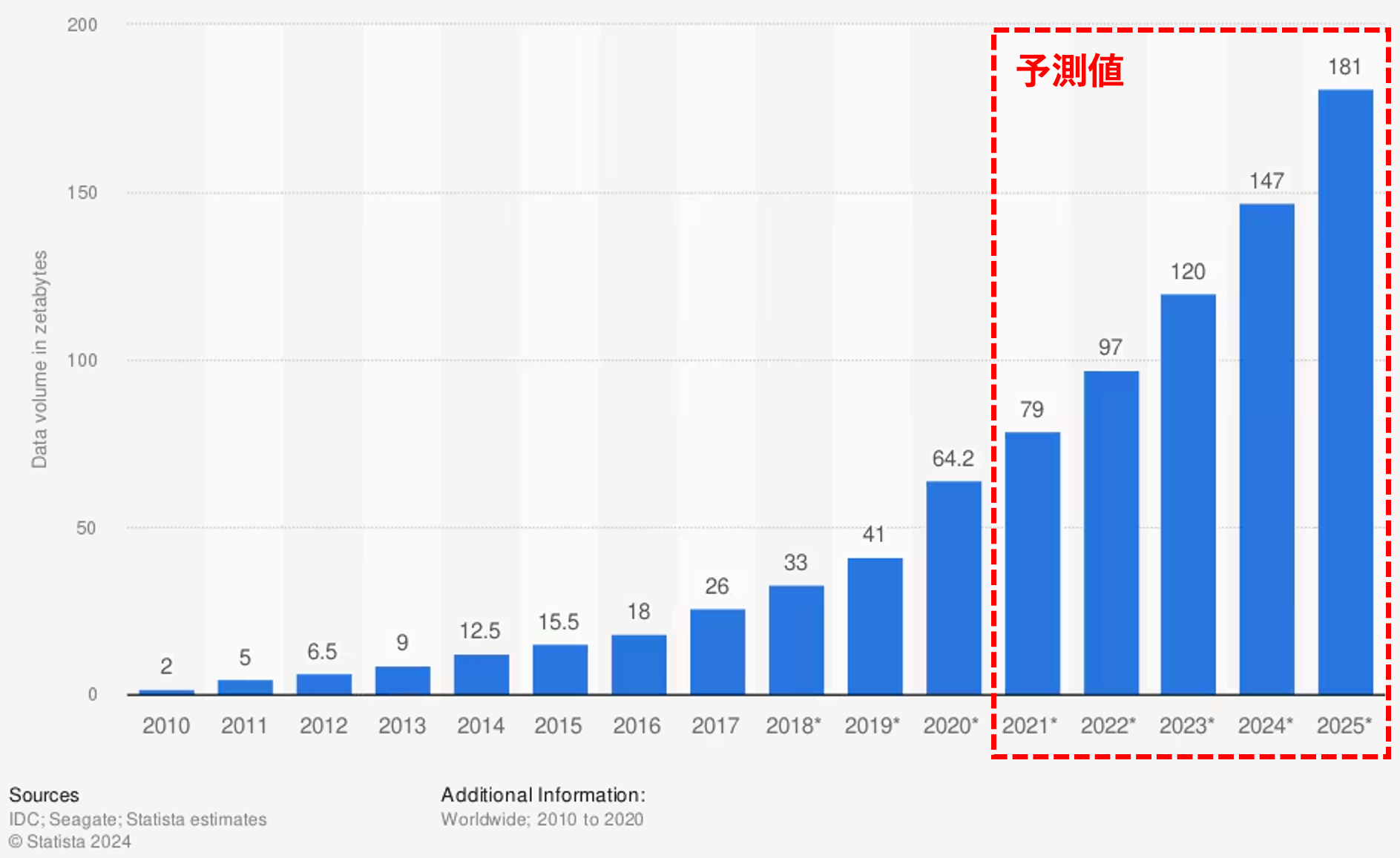 2020年代に入り、世界で生成されるデータ量は爆発的に増加しています。以下は、世界のデータ量の推移を示すグラフです。