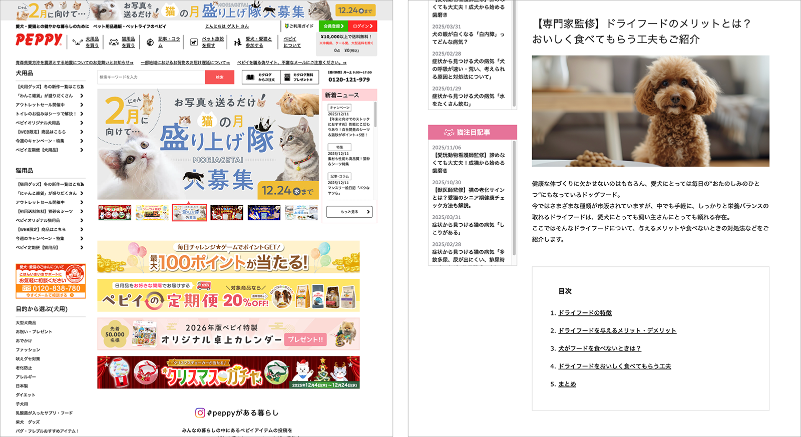 また、読み物コンテンツやしつけ・食事・健康に関するコラムも多く掲載しており、購入前の不安や疑問を解消するための情報提供が充実している点も強みです。コンテンツを通じた信頼構築はペット用品ECでは欠かせない工夫で、ユーザーとブランドやECサイトとの接点を育んでいくための重要な施策の1つと言えるでしょう。