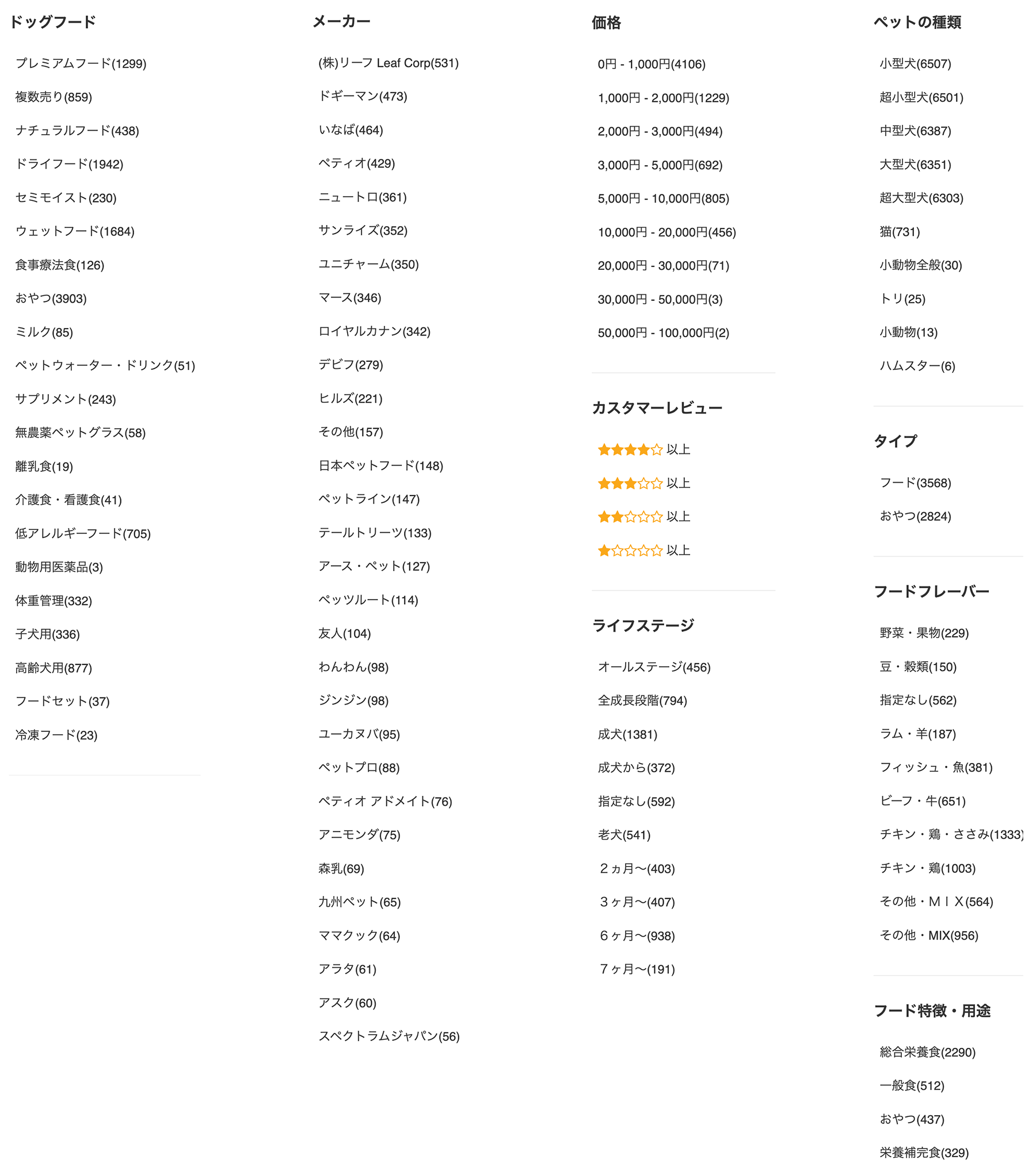 また、カテゴリページ内のファセットナビゲーションも特徴的で、例えば「ドッグフード」であれば、「メーカー」「価格帯」「犬種」「ライフステージ」「フードのタイプ」「フードの主原料」などの条件が細かく設定されており、商品数が多い中でも、必要な条件を組み合わせて効率よく絞り込めます。