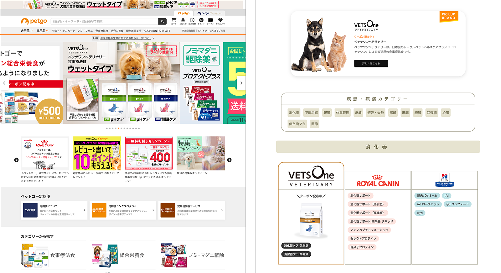 petgoは、獣医師が扱う医薬品からフード・日用品まで幅広く取りそろえている総合ECサイトです。特に特徴的なのは、症状別/目的別検索の細分化で、「関節ケア」「皮膚ケア」「体重管理」など、ユーザーが抱える悩みに応じて、迷わず商品ページへたどり着けるよう、丁寧に導線が設計されています。
