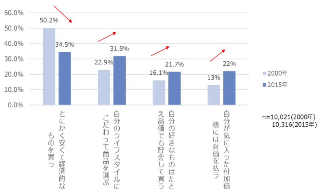 経済産業省の2017年の消費者調査でも、商品選択において「とにかく安くて経済的なものを買う」ことを重視する人は減っており、「自分のライフスタイルにこだわって商品を選ぶ」「気に入った付加価値には対価を払う」と考えている人が増えています。