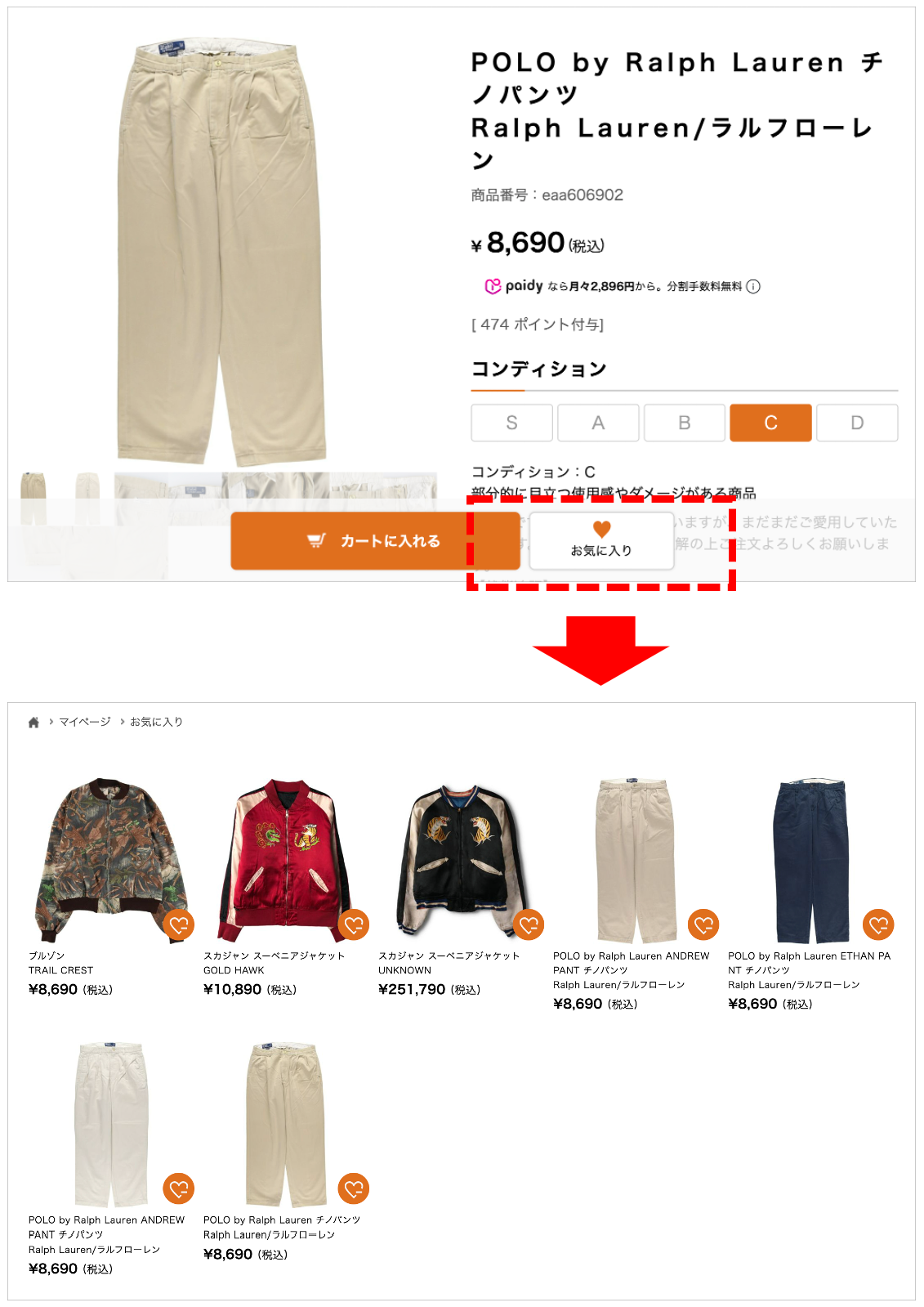 古着は基本的に一点物となるため、同じ商品でも、サイズや状態、価格が異なるため個別の商品ページを用意します。そのため古着ECサイトでは、ユーザーは欲しい商品が決まったら、同じ商品に関する複数の商品ページの固有情報を見比べるというのが、購入検討時の一般的な行動であり、「お気に入り登録機能」は古着ECの重要なUIの1つとなります。