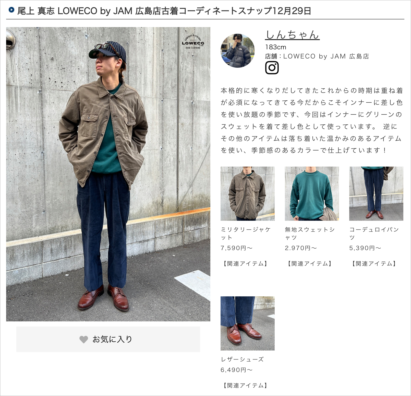 古着屋JAMのECサイトでは、スタッフがモデルとなり商品を着用したコーディネートスナップとともにモデルの身長も掲載しています。
