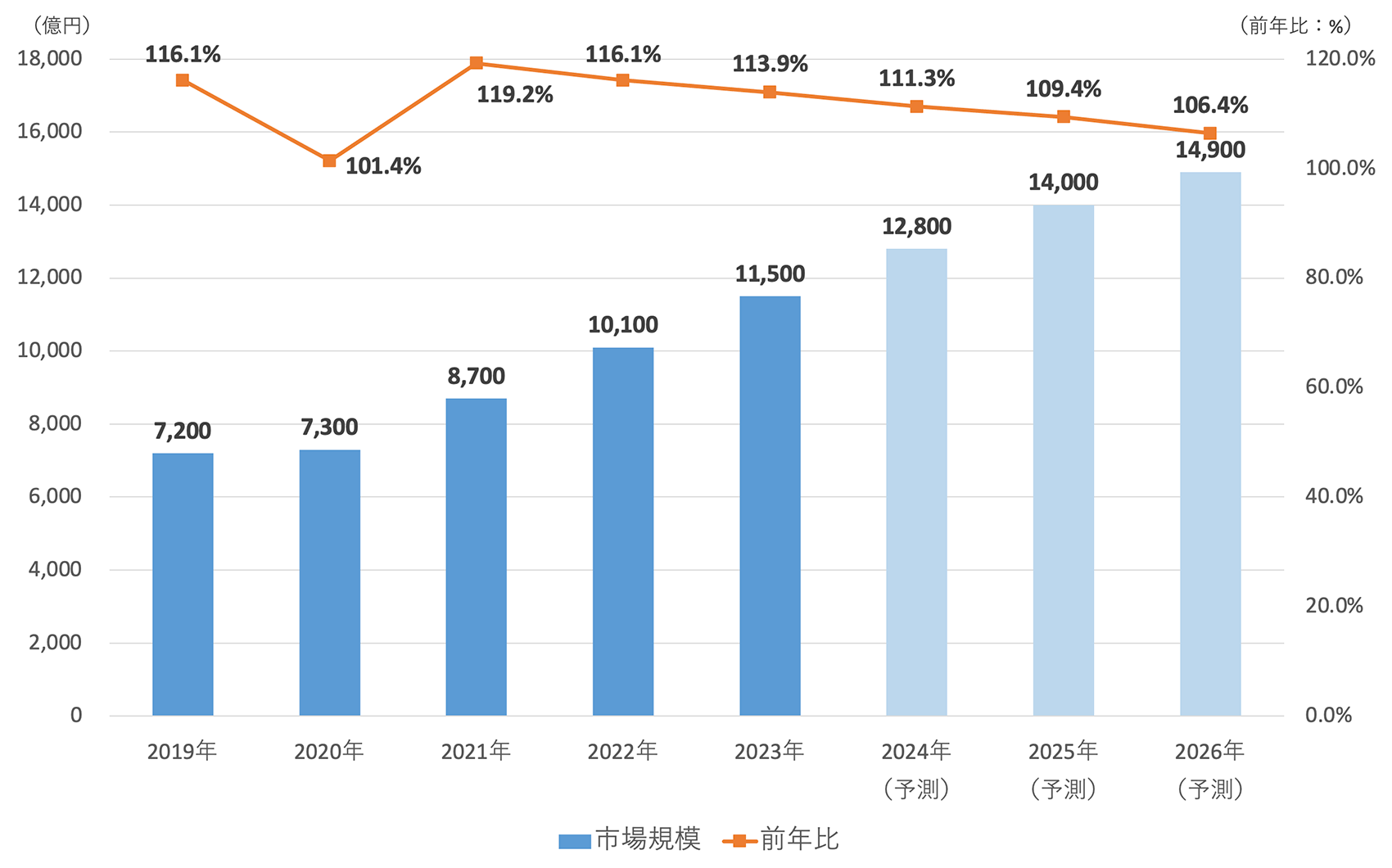 さらに、2024年以降も市場拡大が続く見通しが示されており、2026年には約1兆4,900億円規模に達すると見られています。