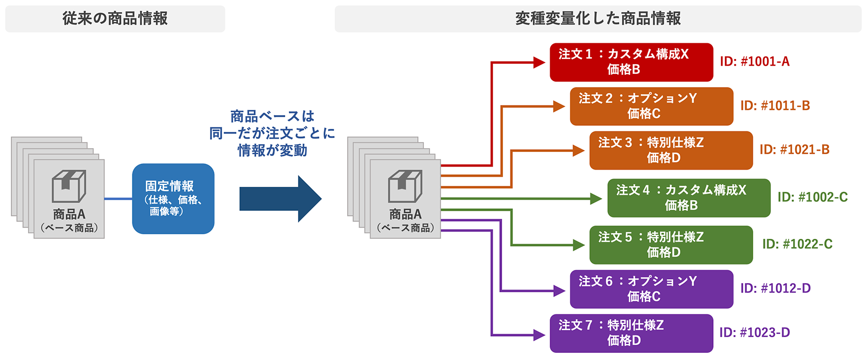 その結果、ECでは「商品名は同じでも内容が都度違う」という受注が増えることになります。つまり、ECの商品データも変種変量化するということになります。