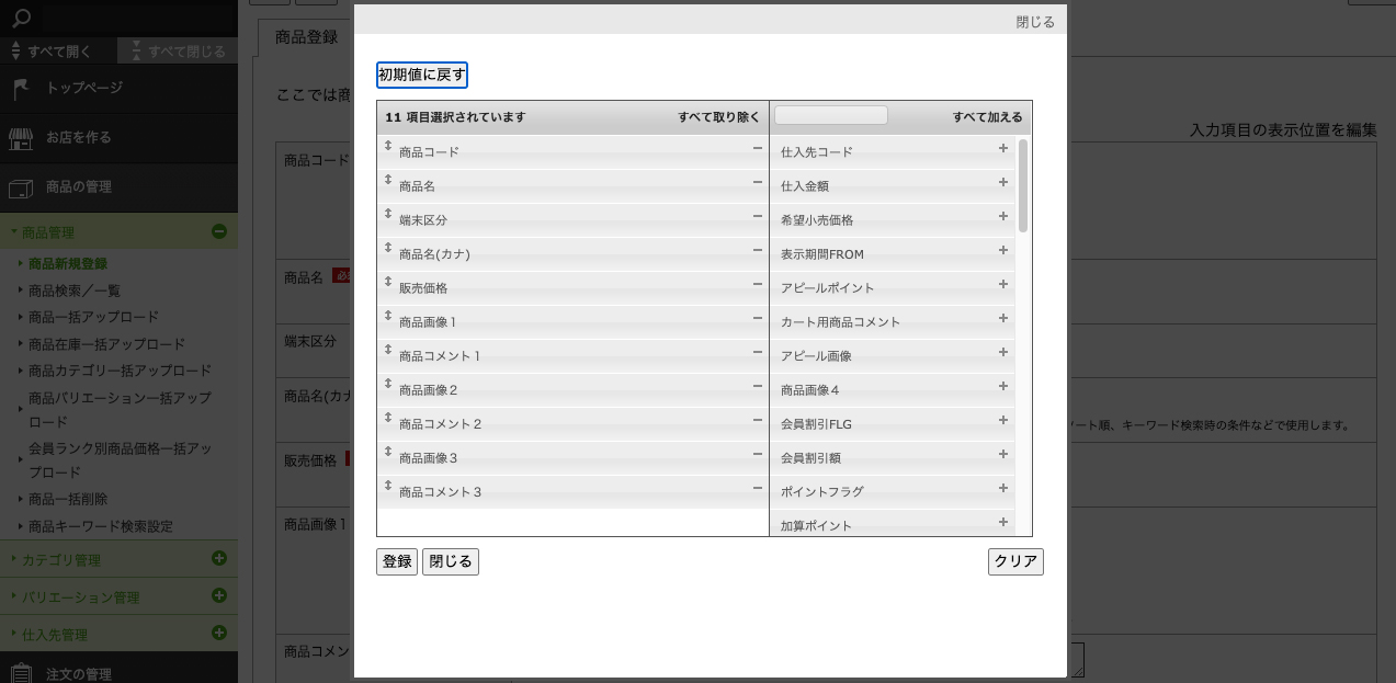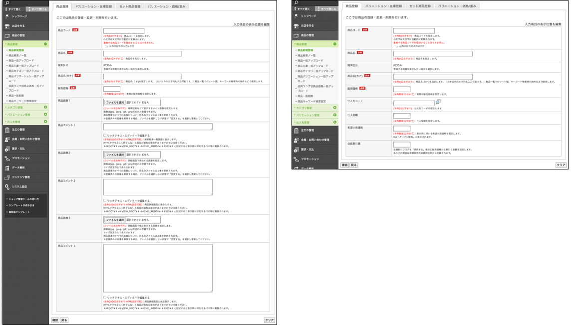 商品の管理 | 商品情報の登録や商品カテゴリ(サイズやカラー)登録などの設定が行えます |
